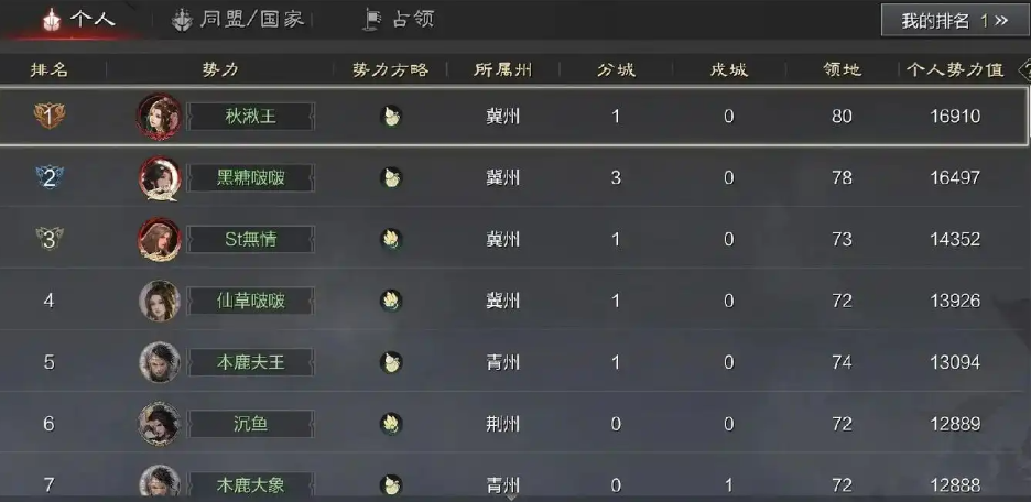 提升个人势力值和名望值同样能间接增加贡献值。势力值主要通过占领和开发高级土地获得,而名望值则与完成游戏内各类成就相关。建议玩家优先攻打六级以上的土地,这类土地的占领不仅能快速提升势力值,还能在后续资源产出中提供稳定支持。合理利用体力与政令,确保在有限时间内高效完成势力扩张目标。