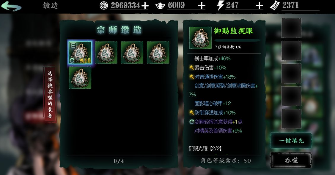 除了直接打造,咱们还可以通过吞噬装备来提升属性,这是变废为宝的好方法。只要给装备喂同样的装备,慢慢把属性喂满,所有词条达到深黄色后就会自动进化成宗师品质。这个方法虽然耗时间,但胜在稳定,不用拼运气,适合长期培养。吞噬过程中会消耗铜币,记得提前准备好资源,避免中途卡住。