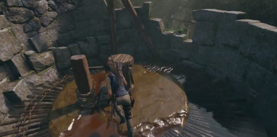 绿色容器作为平衡装置,因破损需快速执行后续步骤。推动石轮至顶端后触发限时机制,玩家需立即从右侧跳至下层平台。绳桩因水流作用下降,需用绳索箭矢将其与对岸断桥的绳桩连接。操作时需精准瞄准,若耗时过长,容器内水流失会导致流程重置。绳索固定后,断桥会被拉起形成通路,玩家即可安全通过。