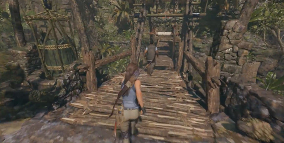 过桥谜题是常见的解谜环节,通常需要结合环境互动与机关操作。以秘鲁丛林断桥为例,玩家需利用水利机关与绳索箭矢完成桥梁修复。首先抵达断桥区域,根据角色对话提示,需登上水塔顶部开启排气阀。沿石轮后方木梯攀爬至塔顶,拉动开关启动水塔运作,随后返回石轮处与同伴协作推动机关,将水流导入绿色容器。