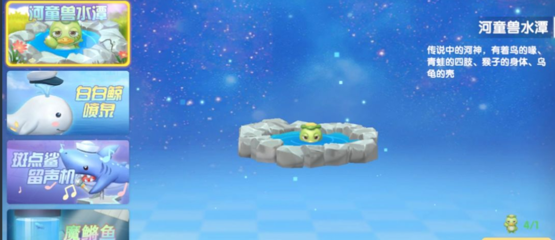 钓到河童后,可前往游乐场门口的NPC大力处兑换专属装饰河童兽水潭。该道具需通过神秘商店的传奇阁界面兑换,功能为提升家园繁荣度与装饰价值。兑换流程为:与大力对话→选择商会信息→进入传奇阁→消耗河童兑换。河童兽水潭占地3×3格子,外观为河童泡温泉的造型,是兼具功能性与收藏价值的家园装饰。