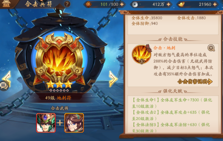 技能联动方面,姜维的挑衅强制敌方攻击自身,因此需通过宝物补充免伤或反伤效果。红色宝物中,狂熊兵符的额外伤害与地刺兵符的控制效果可与其反击机制形成联动,而冰封兵符的暴击增益则需谨慎选择,避免属性溢出。若追求极限输出,可搭配火炽原燎锦囊提升对谋士的压制力,但会牺牲部分生存能力,需根据敌方阵容动态调整。