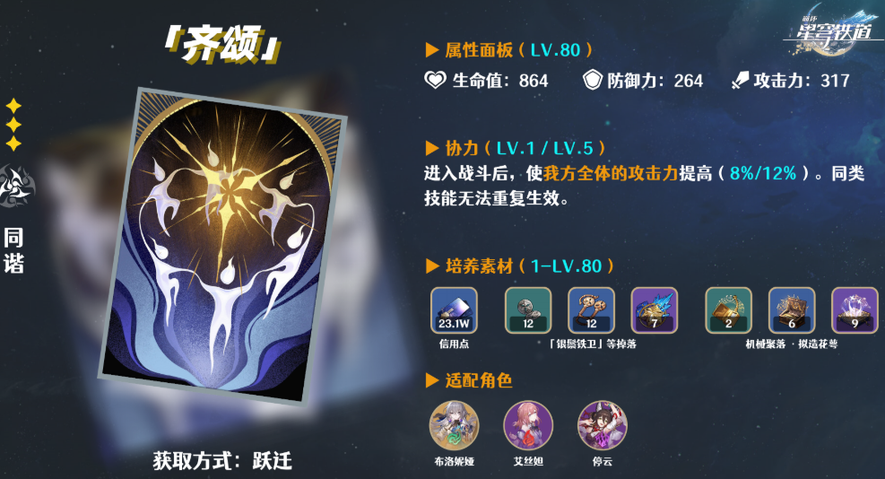 除了轮契之外,齐颂也是可选的三星光锥之一。它的被动能为全队提供攻击力加成,进一步提升停云的辅助能力。不过相比轮契的充能效果,齐颂的增益相对有限,更适合在特定阵容中搭配使用。如果小伙伴手头有轮契,建议优先选择它;若暂时没有,齐颂也能作为备选过渡。