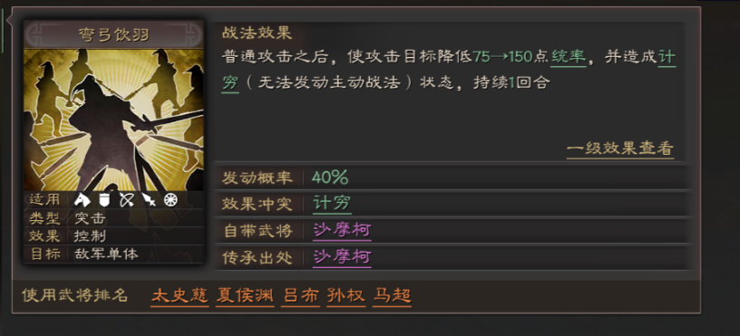 相较于父亲的铜墙铁壁,孙策的职责就是全力输出。其自带战法江东小霸王在前三回合能提供宝贵的破阵状态(无视敌方统率、智力),并且普通攻击有概率震慑敌人,当孙策担任主将时这一概率还会提升。孙策战法搭配的核心思路就是最大化其普通攻击频率和单次攻击的伤害,以频繁触发震慑并利用破阵状态打出高额伤害。最基础的思路是携带强攻来获得连击状态,增加普攻次数。输出战法的选择上,手起刀落、暗藏玄机这类突击战法是不错的选择,能与连击效果良好配合。资料中也常提及弯弓饮羽,它在造成伤害的同时还能降低敌军统率,变相提升全队的兵刃伤害。后期若拥有所向披靡等高伤害主动战法,配合破阵状态也能产生爆发性的输出效果。