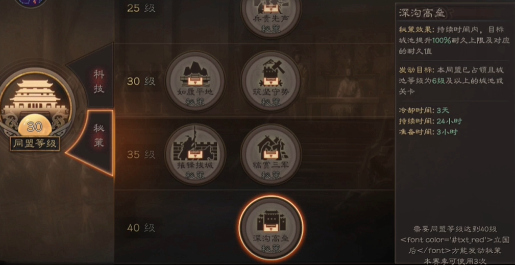 不同的秘策有明确的等级要求,例如兵贵先声秘策需要同盟达到25级,筑坚守势秘策要求30级,而深沟高垒秘策则需要同盟升至40级才能解锁。这些等级门槛确保了秘策的获取与同盟的实力阶段相匹配,玩家需要耐心积累同盟经验,逐步解锁更高级的秘策以增强战略优势。