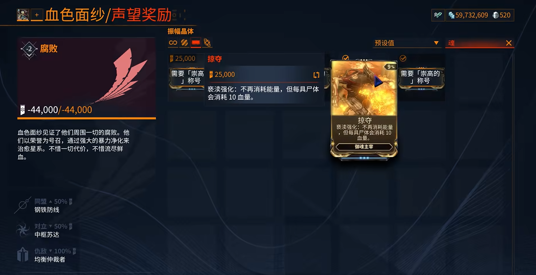 六大集团分为两大互斥阵营,左阵营为钢铁防线、中枢苏达、均衡仲裁者,右阵营为佩兰数列、血色面纱、新世间,玩家只能效忠同一阵营的三个集团,佩戴对应纹章做任务时,同盟集团声望同步增长,敌对集团声望则会衰减。右阵营集团的核心优势在于提供大量实用的战甲振幅晶体,也就是集团卡,这些卡片能直接强化战甲核心技能,让新手在开荒阶段快速获得战力提升。血色面纱的庇护烟幕可为灰烬之刃提供群体隐身,大幅提升生存与输出环境;佩兰数列的二元一体能强化双子分身的伤害与持续时间,让分身流玩法成型更快;新世间的集团卡则能优化控场类战甲的技能效果,适配磁力、洛基等新手常用战甲。相比之下,左阵营集团更侧重专属武器、空战部件等装备兑换,这类装备对新手前期战力提升的即时性远不如集团卡,且获取周期更长,不适合快速开荒。
