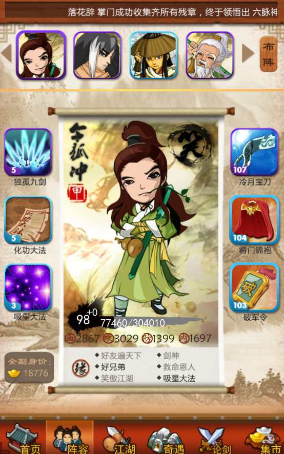 天卷洗练还要配合套装效果与弟子羁绊,天卷与地卷、人卷组成绝技套装,套装效果有狂攻、壁垒、慧心、激怒等,攻击弟子搭配狂攻套装,额外提升基础攻击,防御弟子搭配壁垒套装,增加基础防御,内力弟子选慧心或激怒套装,强化技能效果。洗练时要兼顾套装与天卷属性,让套装效果与天卷词条相互加成,比如狂攻套装搭配攻击天卷,双重提升攻击属性,战力叠加更显著。同时结合弟子羁绊,部分弟子羁绊有属性加成,天卷洗练可针对性补足短板,比如羁绊加攻击的弟子,天卷可多洗暴击与破招,羁绊加防御的弟子,天卷多洗抗暴与格挡,让弟子战力突破极限。
