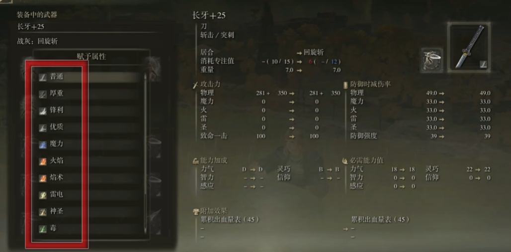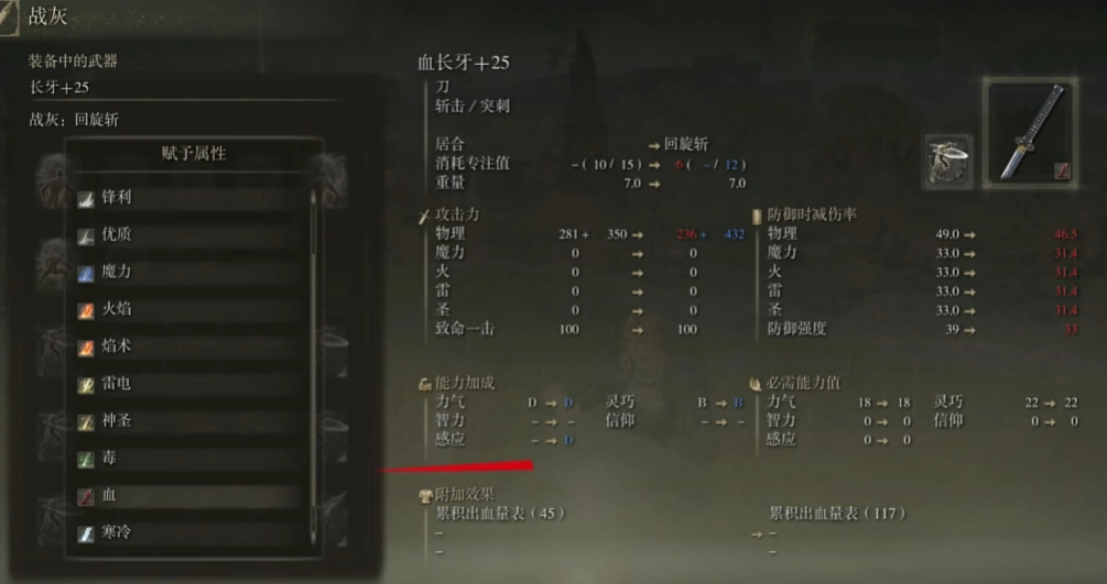获得漆黑砥石刀后,玩家需要在任意赐福点选择战灰功能进行操作。在战灰界面中可以看到各种质变选项,包括血、毒、神秘等特殊属性。选择血质变后,武器将获得感应补正和灵巧补正,同时会显著提升出血属性的积累效率。需并非所有武器都适合血质变,通常快速攻击的轻武器能更好发挥出血效果。