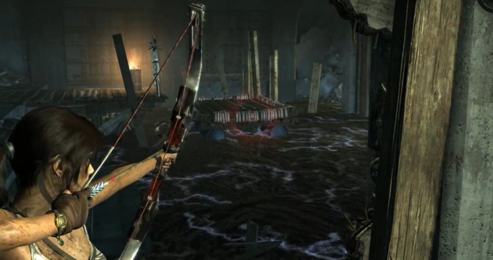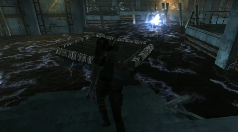 被激活的导电装置会使水面带电,需重新拉高水位至第二层。当水面接触顶部断裂的电线时,短路效应会暂时切断电源。抓住这约15秒的安全窗口,迅速游向水池西北角的通道,通道尽头可见被电网封锁的宝藏室入口。使用霰弹枪击碎角落的木质挡板可找到备用电路开关,关闭电网后即可进入最终区域。