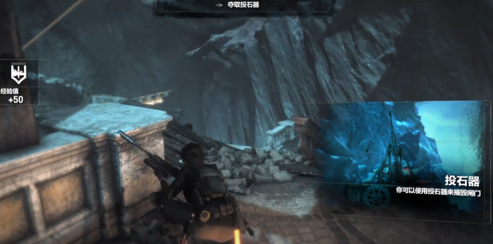 首先需要找到投石机的位置,通常位于城门附近的平台上。投石机被冰块冻结,需先破除冰块才能操作。利用绳索箭矢将熔炉拖至冰块附近,跳上熔炉使冰融化。随后攀爬至投石机平台,调整投石机方向对准城门,用绳索连接投石机与固定柱,最后发射投石机破坏城门。